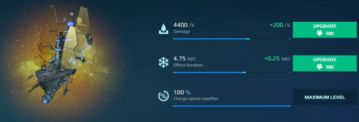 | Aurora Borealis:少しの遅延の後に、自機と範囲内の対象の耐久値を修復する軌道ビームを発射。機体の耐久値を超える回復量は追加のイージスシールドに変換され、更に追加の防御ポイントを獲得。 | |