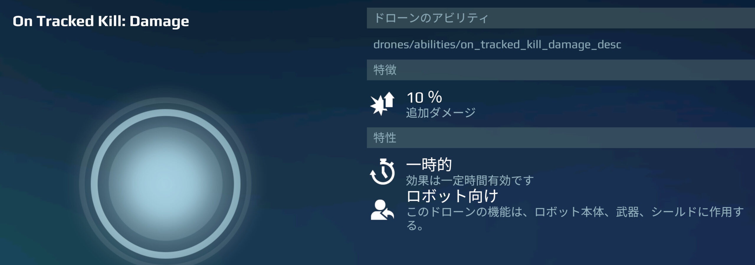 現時点のテストサーバー表記では、スキル名がKill: Damageとなっているため、Track状態の敵ロボットを破壊する事で一定時間のダメージボーナスを獲得する効果と捉えられるが、テストサーバー内で同様の手順を行ってもバフ一覧に表示されないことから、前述の通りTrack状態の敵に対する与ダメージ増加効果として表記しています。