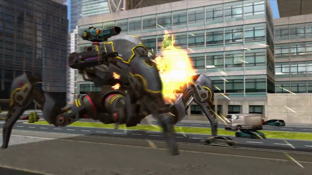 入力方向に跳躍ジャンプ。着地時にSuppresion効果のAoeを発生させ、周囲の敵ロボットのダメージを一定期間低減させます。更にジャンプ中と着地から5秒間、防御ポイントを獲得し、被ダメージを軽減します。 | |
