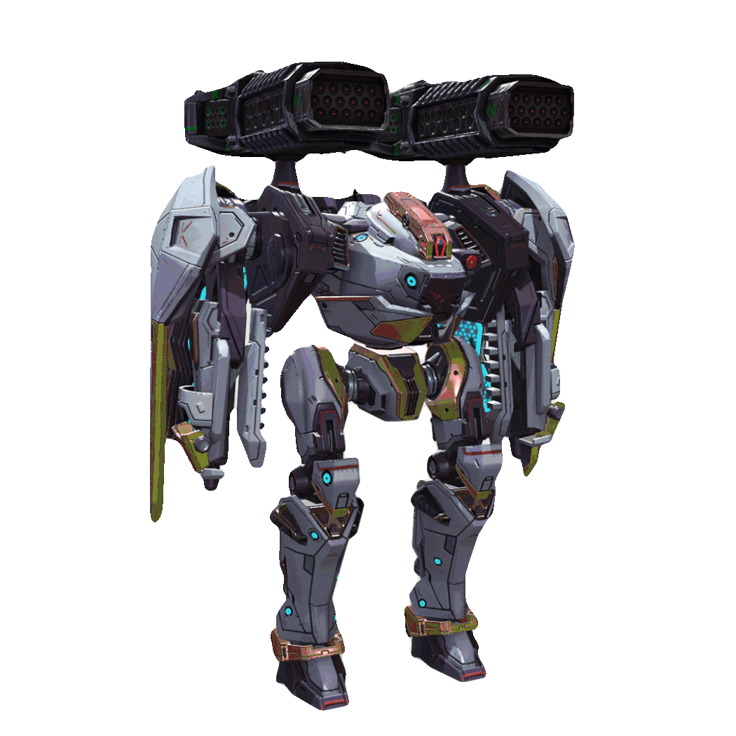 - アビリティを起動すると、空に飛びあがり、移動速度が50%(73km/h)上昇し、ターゲットと30°周囲の複数の敵ロボットにまとめてダメージを与える内蔵武器で攻撃。
