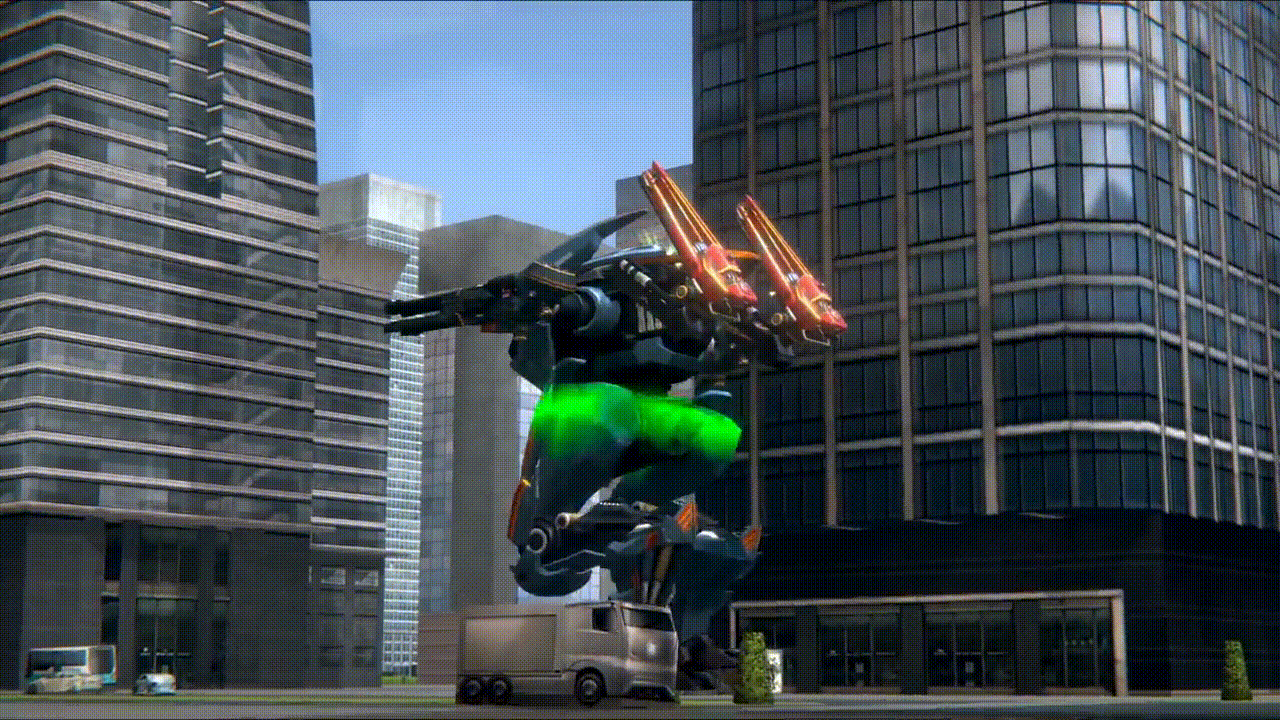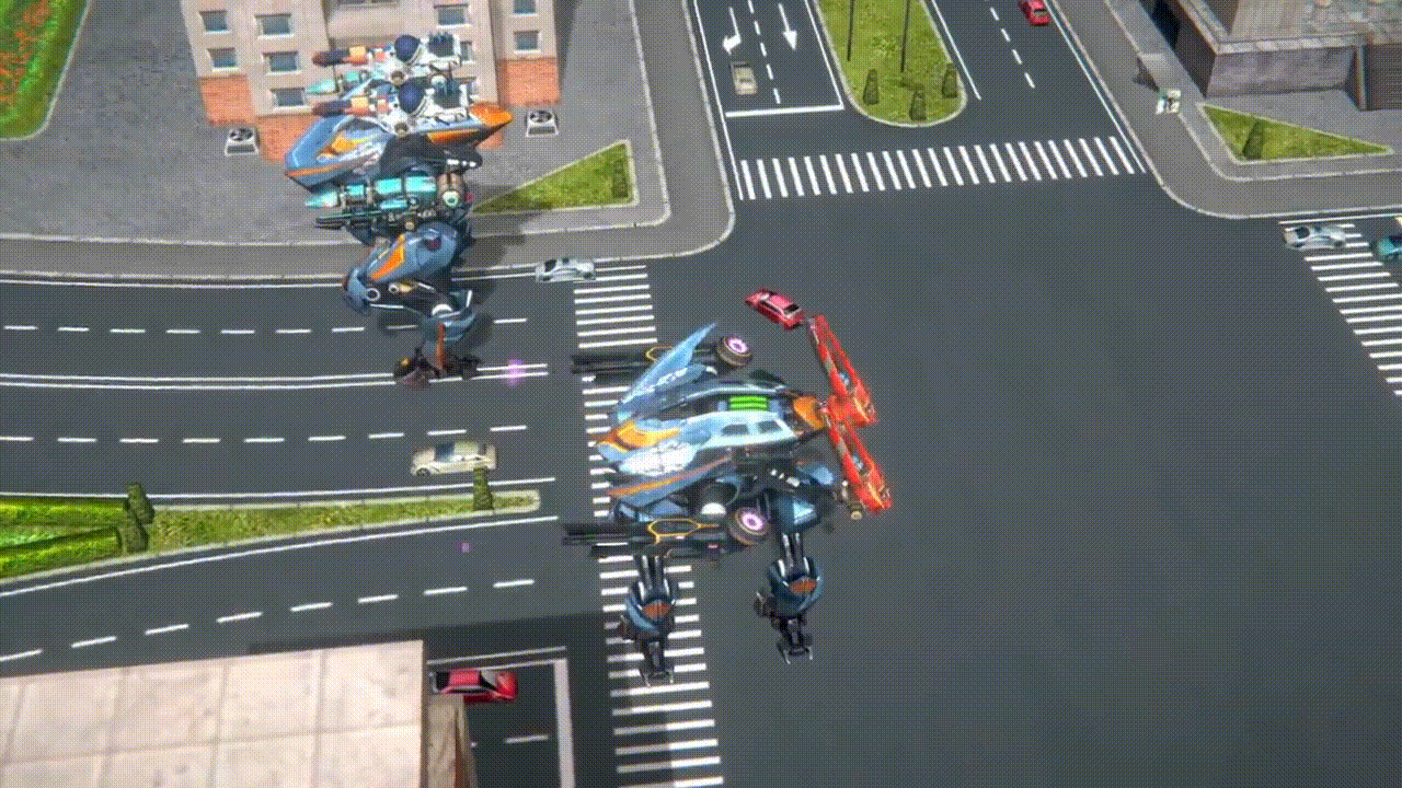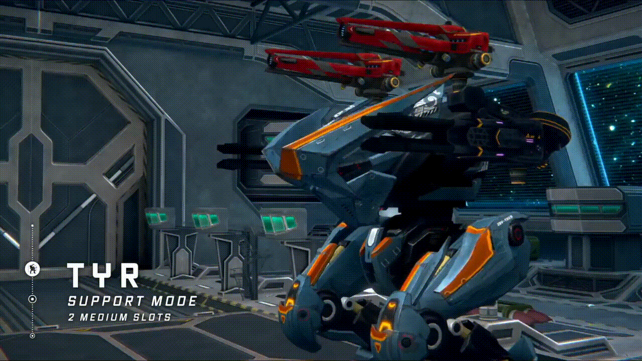 - 攻撃モード:修復能力、速度バフが喪失。軽武器を展開し、計4つの武器(中×2 軽×2)で攻撃する。物理シールドを前面に展開し、実弾、エネルギー系武器からのダメージを防ぐ。